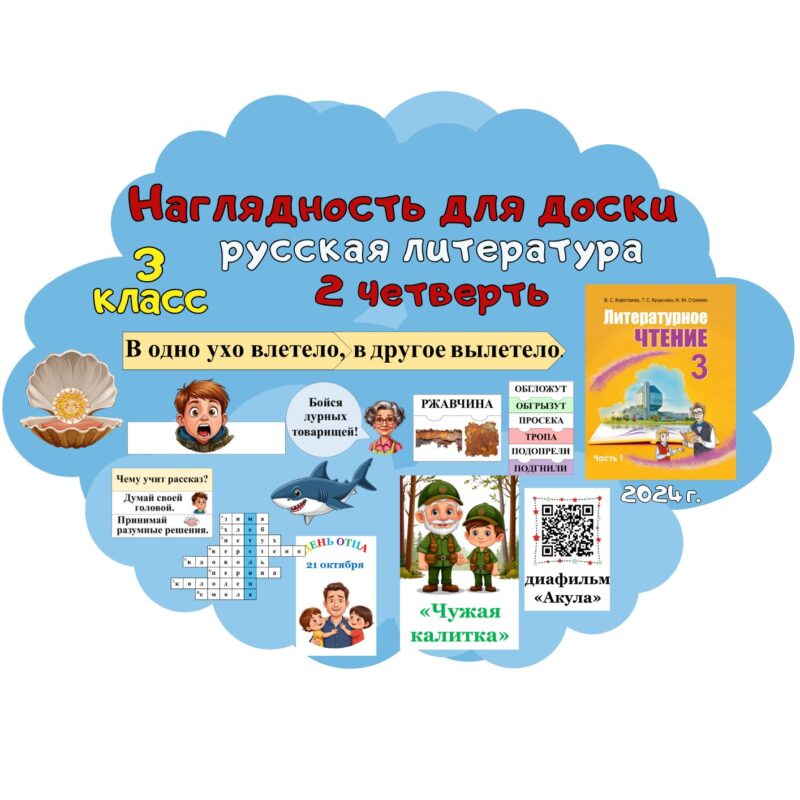 Наглядность к РЛ для доски. Они соответствуют учебнику В.С. Воропаева, Т.С. Куцанова, И.М.Стремок, Академия образования, 2024 г. Названия произведений, ободки с героями для чтения по ролям, схемы, рифмы, хар-ки героев, QR-код (можно распечатать маленьким размером и раздать детям для просмотра дома) и т.д. 10 уроков. Уроки внеклассного чтения НЕ включены. ЛИТЕРАТУРНЫЕ ВОЛШЕБНЫЕ СКАЗКИ «Сказка о…