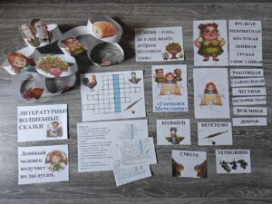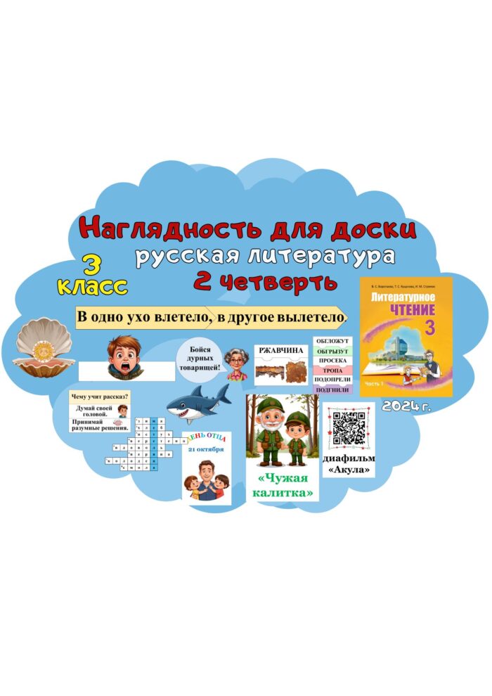 Названия произведений, ободки с героями для чтения по ролям, схемы, рифмы, хар-ки героев, QR-код (можно распечатать маленьким размером и раздать детям для просмотра дома) и т.д.